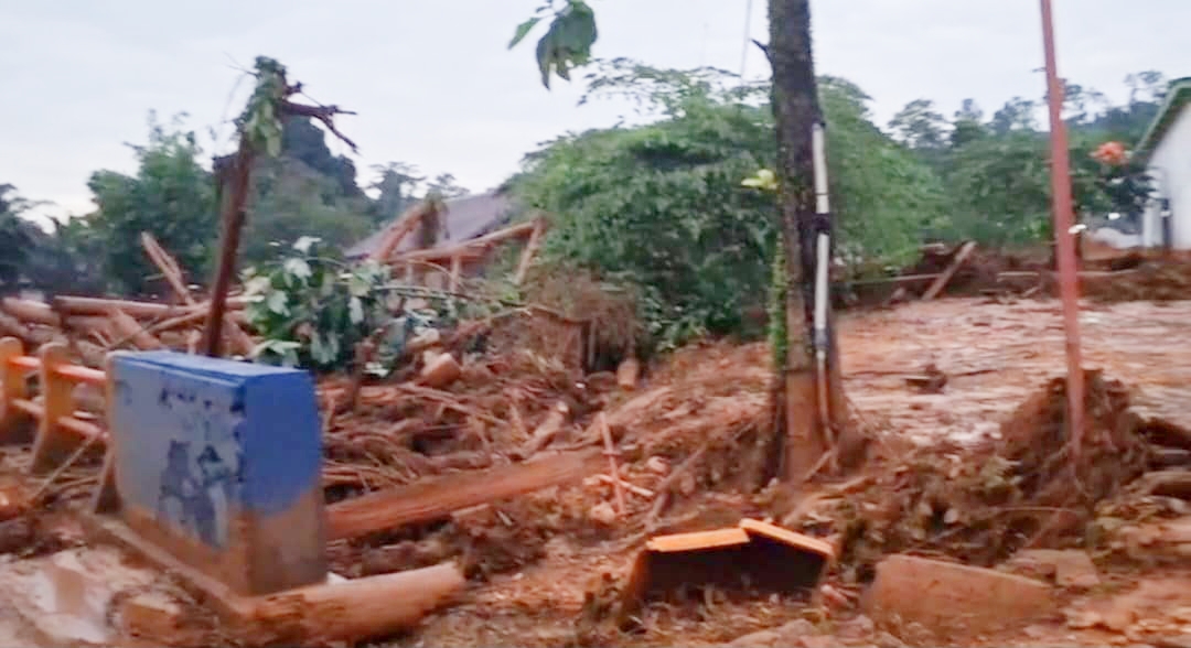 Akibatnya lumpur tebal menutupi badan jalan di desa itu. Potongan-potongan kayu juga terbawa banjir. Pemukiman warga rusak.